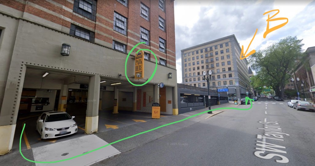 The green arrow indicates that SW Taylor is a one-way street. Keep this in mind when driving in (or, just space out and let google maps navigate for you).